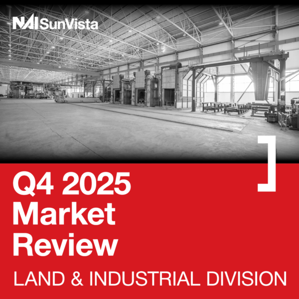 The Land and Industrial Q4 market research and data is compiled by NAI SunVista commercial real estate land and industrial specialist, Riley McKee. Riley advises industrial and logistics real estate owners and occupiers on leasing, acquisitions, and dispositions.