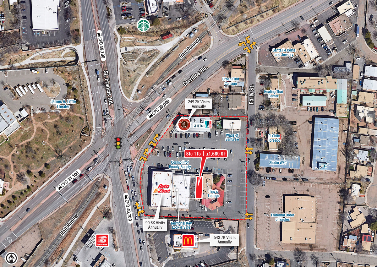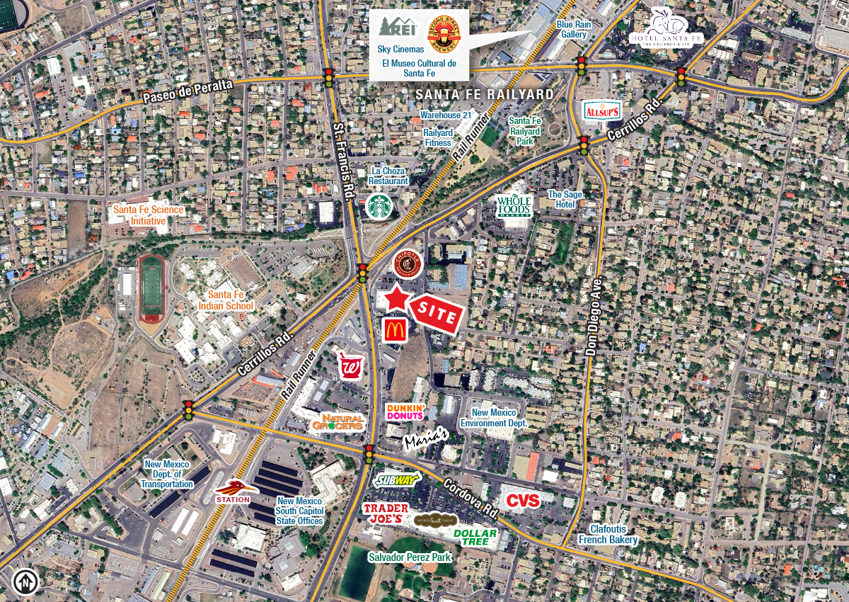 - Prominent pylon signage at signalized intersection of St. Francis & Cerrillos Rds.