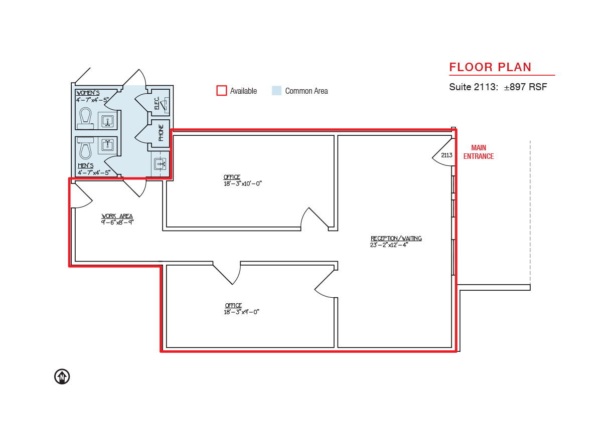 - Suite includes reception area, two offices, storage and two restrooms (Shared with Suite 2115)