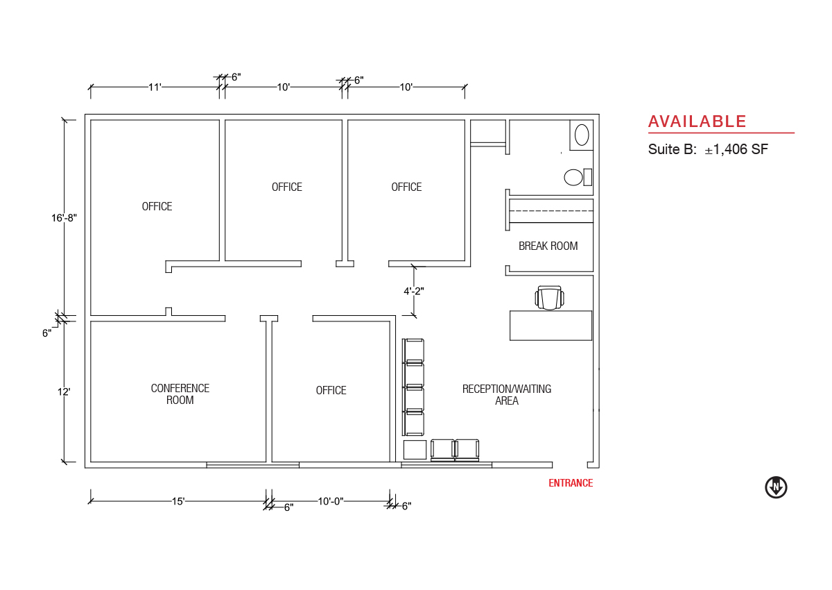 - 4 offices, conference room, reception/waiting area, break room and restroom