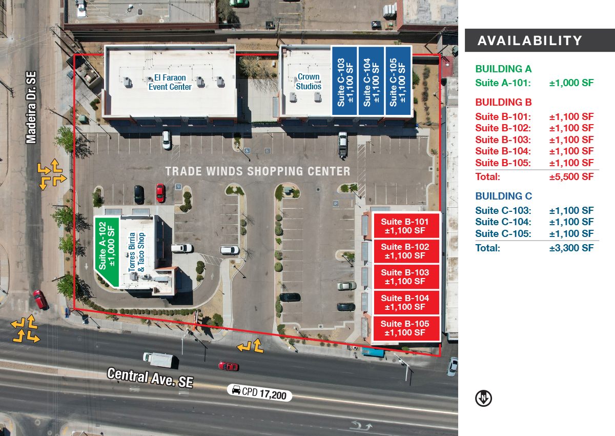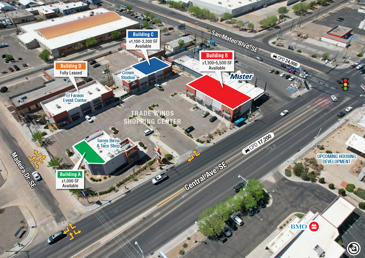 The Trade Winds shopping center is located near the corner of Central Ave. & San Mateo Blvd. just east of Nob Hill. The former Route 66-era Trade Winds Motel was redeveloped with the intention of bringing affordable, new retail to the area. Prices are well under comparable lease rates in the area. This highly-visible and iconic property has many options for local and national users alike.